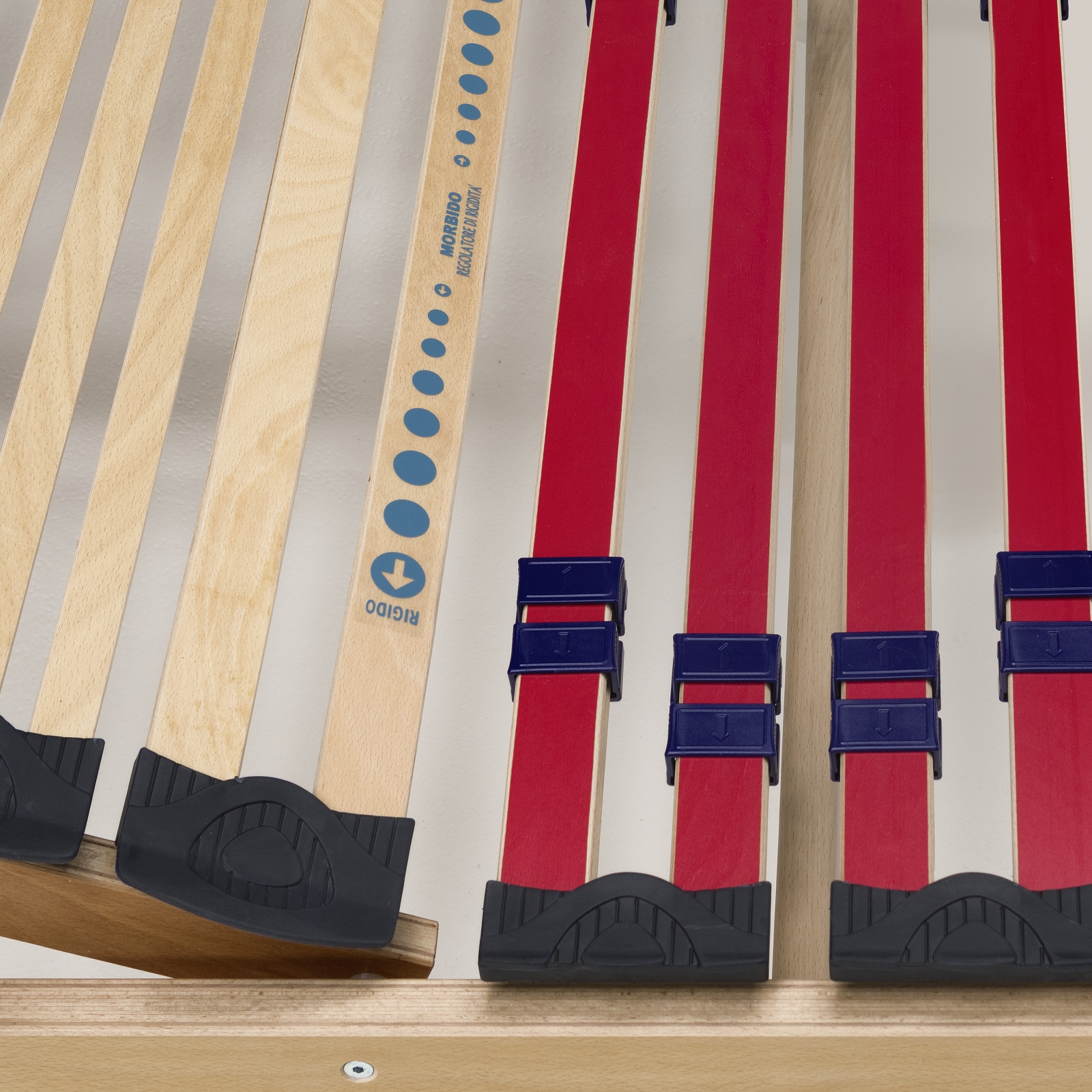 Telaio con struttura in multistrato di legno di faggio evaporato con profilo da mm 60×25, sul quale sono incastonate 26 doghe da 38 mm x 8 mm in multistrato di faggio evaporato e curvato a caldo, 4 coppie di doghe sono dotate di cursori regolatori della rigidità nella zona lombo-sacrale per un sostegno calibrato e confortevole. Le doghe sono montate su speciali supporti basculanti in SEBS che assicurano un molleggio anatomico consentendo di adattarsi in qualunque situazione. Telaio realizzato in legno di faggio 60×25 mm con finitura naturale, ammortizzatori basculanti in SEBS come supporto alle doghe in multistrato di faggio, fanno di questa rete il giusto completamento di un sistema di riposo confortevole ed efficace.